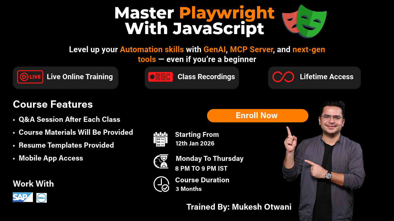 You’ll learn JavaScript, Playwright, Mocha, Chai, Git, GitHub, Jenkins, Docker, AWS, and AI-powered tools like GitHub Copilot and ZeroStep for writing test cases in plain English.